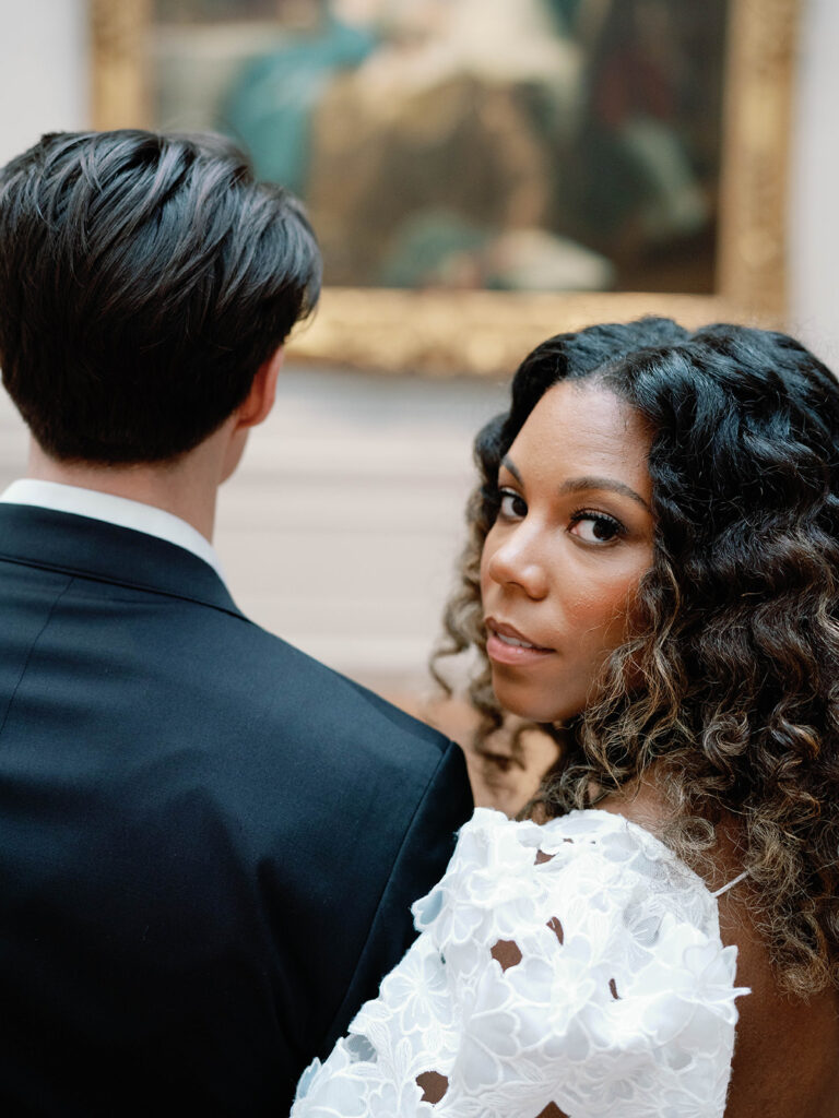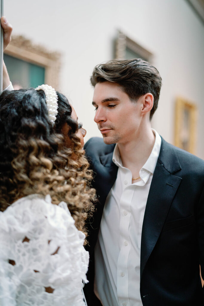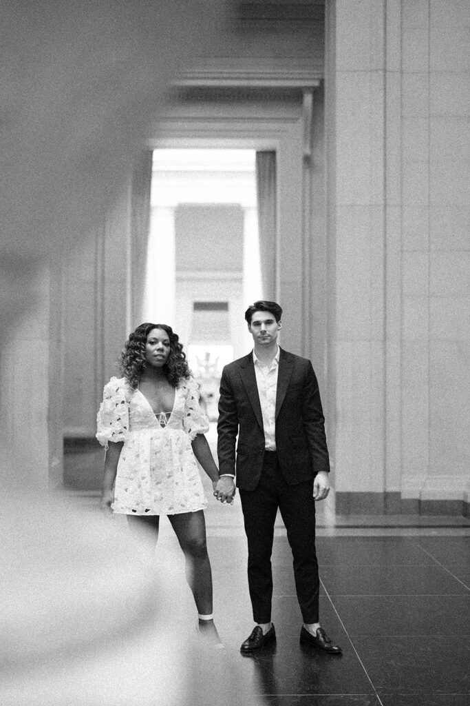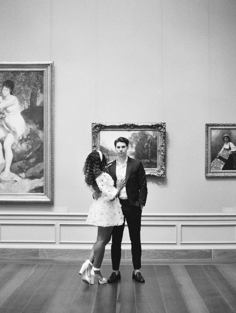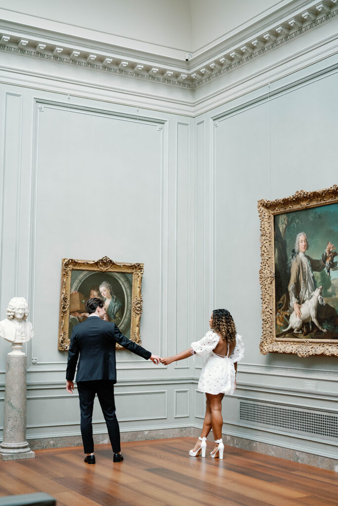 Mitchell and Alexis, high school sweethearts actually got engaged in a museum, so it felt very right to have their engagement session at a museum too. I met them at the National Gallery of Art Museum in Washington, DC, right next to The Mall. The bride had two looks for their session. Look one was more sleek and perfectly paired with the columns and architectural details outside of the building, while look two was more romantic and had feeling, much like the subjects we saw in many of the paintings. The two held hands while walking through the museum before a quick put stop to pick up some gelato. The two will wed later this year.